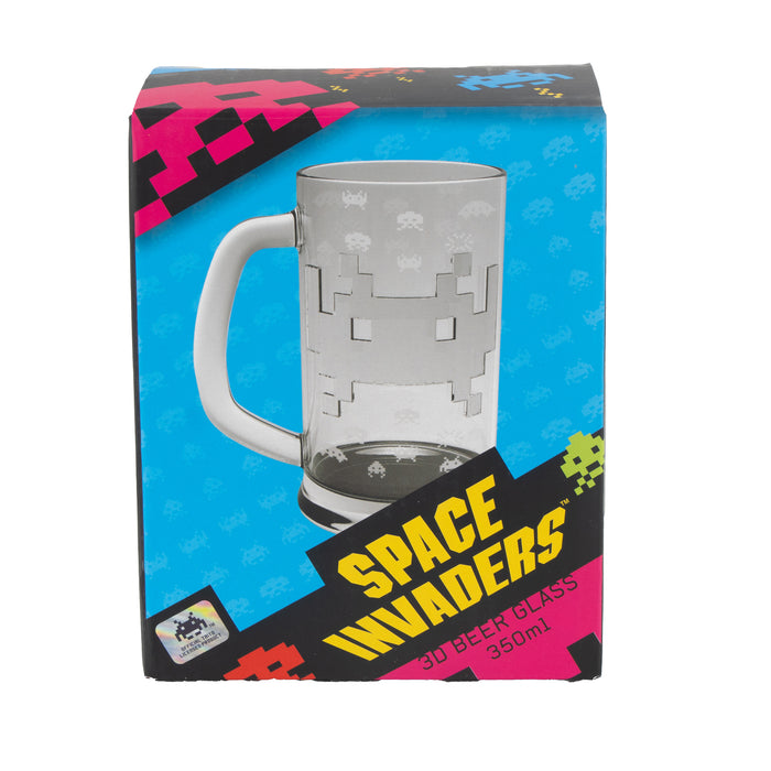 Het bierglas is gemaakt van robuust helder glas en biedt met een inhoud van 350 ml genoeg ruimte voor je biertje na het werk, een frisdrankje of wat je maar bij je volgende spelavond wilt hebben. De rondom bedrukte Space Invaders motieven - inclusief de klassieke vijandelijke formatie en de bekende letters - zorgen ervoor dat de nostalgische vibe bij elke slok aanwezig is. Dankzij het stevige handvat ligt het glas prettig in de hand.