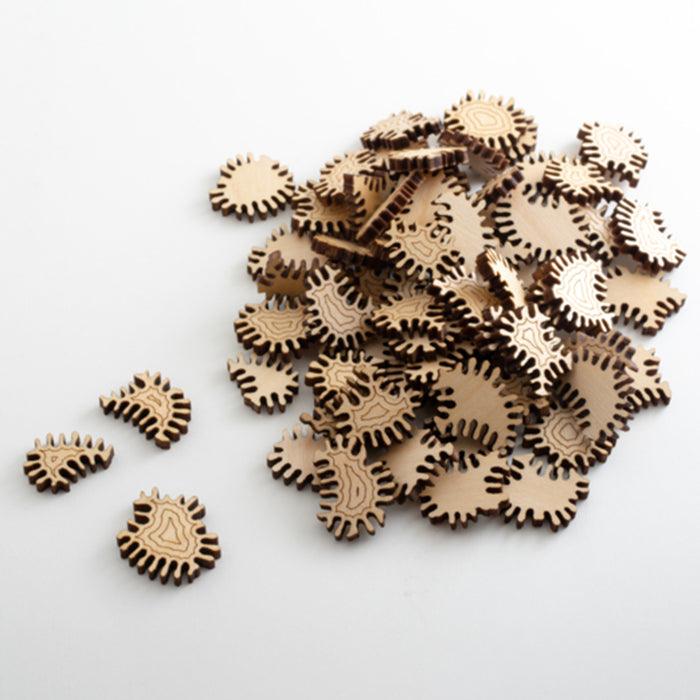 Im Set erwarten Dich Holzteile in Amöben-Form, die auf der einen Seite ein organisches Muster ziert, während die andere Seite blank ist. Jedes Teil wurde unabhängig von den benachbarten Teilen geschnitten, sodass Du die Maserung des Holzes beim Zusammenbau nicht als Orientierungshilfe nehmen kannst. Wie gesagt, schwieriger als gedacht. ;)