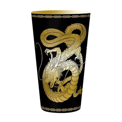 Und tatsächlich ist das Dragon Ball Trinkglas Shenlong eine Besonderheit: Mit seiner schwarz-goldenen Färbung hebt es sich von allen anderen Trinkgefäßen in deinem Schrank ab. Es zeigt zwei detaillierte Motive von Shenlong und den Dragon Balls und trägt am Rand eine Verzierung.