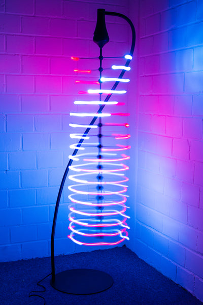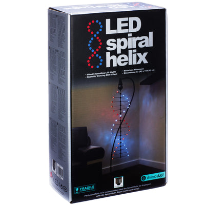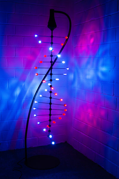 Die leuchtende LED-Helix ist nämlich derart gestaltet, dass sie große Ähnlichkeit mit dem Strukturmodell eines DNS-Moleküls aufweist. Wenn man denn so möchte, dann repräsentieren die roten LEDs die sauerstoffhaltigen Nukleinbasen und die blauen LEDs die stickstoffhaltigen. Aber damit noch nicht genug: Alle 45 Sekunden setzt ein integrierter, nahezu geräuschloser Motor einen Impuls kinetischer Energie frei, die dafür sorgt, dass sich die Helixkette um sich selbst dreht - genauso, wie es in Animationsbildern von Desoxyribonukleinsäure (siehst Du, da haben wir das Wort schon wieder!) gern dargestellt wird. Ganz nebenbei sorgt diese Bewegung gerade in abgedunkelten Räumen für wunderschöne Lichteffekte an den Wänden. Schau Dir am besten das Video an, um einen kleinen Eindruck zu gewinnnen.