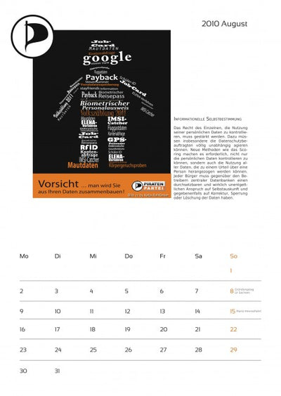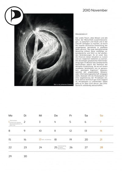 Jeder Monat ist mit einem piratigen Bild und einem Text zu Piratenthemen versehen und der Kalender enthält bereits einige piratige Termine. Noch ein Hinweis: Im Oktober wurde leider der Hinweis auf die Firma vergessen, die den Piraten die Projektionsmaschine stark subventioniert zur Verfügung gestellt hat. Daher hier noch einmal der Dank an Oliver Bienkowski von Lightartist.