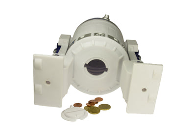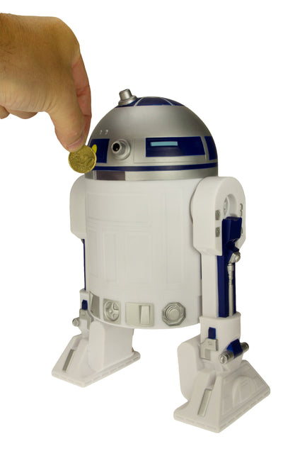 Vorbei sind die Zeiten, in denen Du Spardosen (damals häufig in Schweinchenform anzutreffen) martialisch mit einem Hammer zerstören musstest: Am Boden von R2D2 befindet sich ein einfacher Schraubverschluss, der es jederzeit ermöglicht, Geld auch mal herauszunehmen, um es in andere schöne Dinge bei getDigital zu investieren (z.B. mehr R2D2 Produkte).