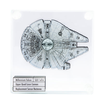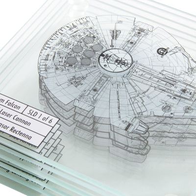 • Jeder Untersetzer zeigt einen Teil des schematischen Aufbaus des Millennium Falcon