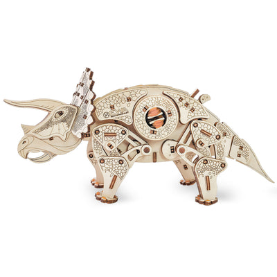 While we wait, we can pass the time with the Eco-Wood-Art Wooden Kit 'Triceratops': This kit contains laser-cut wooden parts that can be assembled into a detailed model of a Triceratops. And the best part? The dino can even walk! Once you wind up the built-in rubber band motor, the Triceratops will start to happily stomp around!