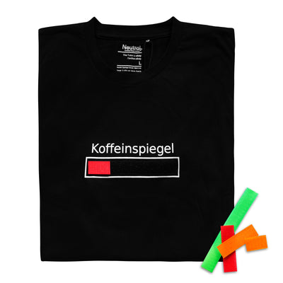 On the front of the T-shirt, under the inscription 'Caffeine Level,' you will find a white-bordered Velcro strip on which you can attach the three included strips in the colors red, green, and orange. On the left in the picture, you can see this demonstrated with the Patience Thread Shirt. The colorful strips can easily be cut into smaller pieces with scissors, allowing you to dynamically adjust your personal caffeine level. This means the days of scaring off your colleagues with a grumpy growl are over. ;)