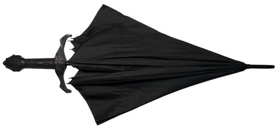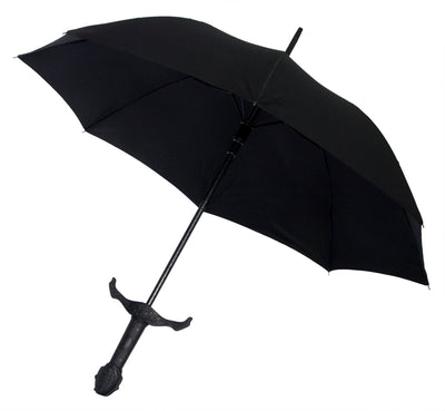 The Knight's Sword Umbrella is a black cane umbrella with an extra-long handle that looks like that of a knight's sword. The Knight's Sword Umbrella is very high quality and made of sturdy plastic, metal, and fabric. Directly above the handle is a button that allows you to automatically open the umbrella.