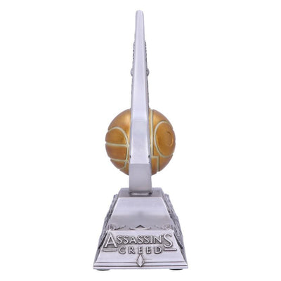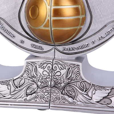 • Buchstützen in Metalloptik, in die ein goldfarbener „Edenapfel“ aus den Assassin's Creed-Spielen eingelassen ist