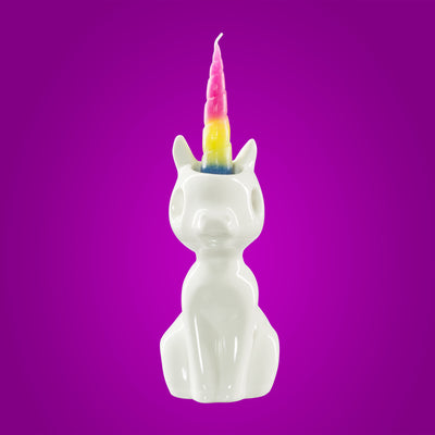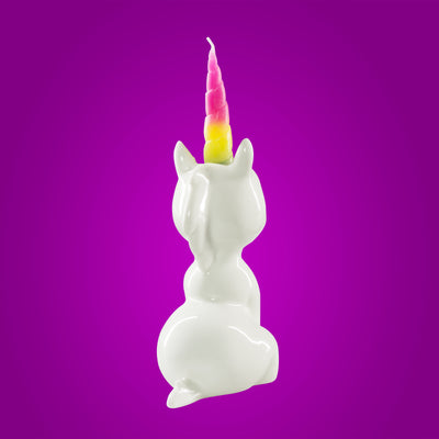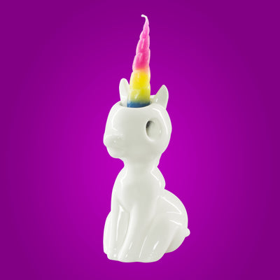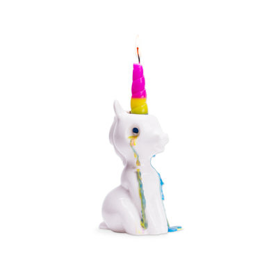 Este candelabro de porcelana se modela en un unicornio deprimido que se agacha en el piso. Tan pronto como anuncia una de las dos velas del arco iris y la cera comienza a derretirse, el pequeño unicornio ya no puede controlarse y comienza a llorar. Los colores brillantes de las lágrimas aseguran que la noble criatura mítica leiiiicht espeluznante. Si su unicornio ha acreditado todas las lágrimas, puede hacerlo con las correctas Velas de reemplazo Trae nuevamente al borde del abismo y vengue durante todos los años llenos de terribles productos de unicornio. ;)