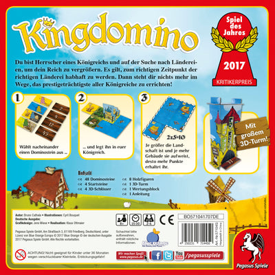 Inhalt: 48 Dominosteine, 4 Startsteine, 4 3D-Schlösser (4-teilig), 8 Holzfiguren, 1 3D-Turm, 1 Wertungsblock, 1 Anleitung