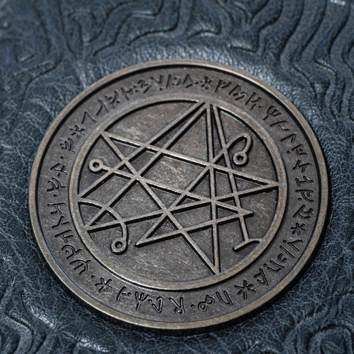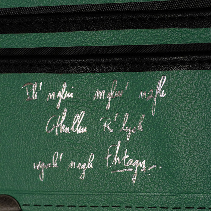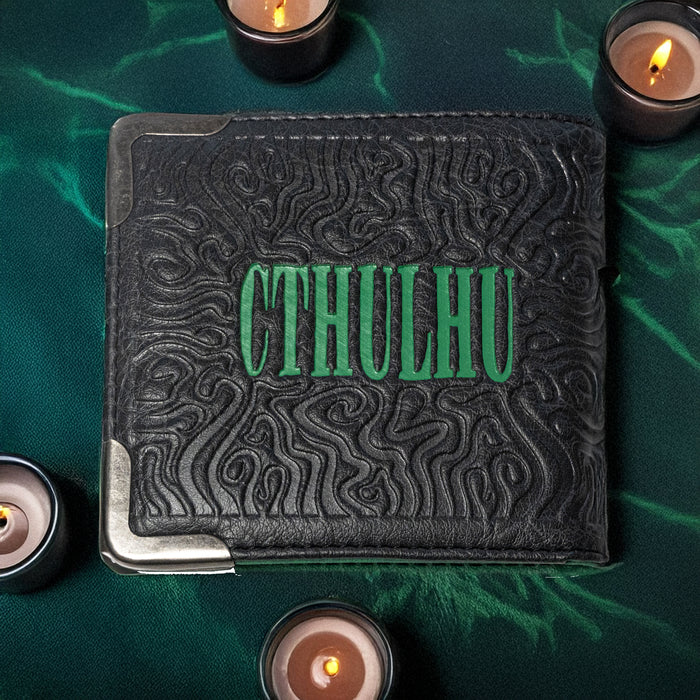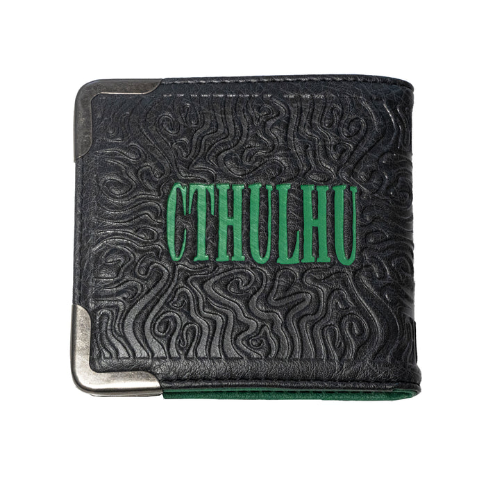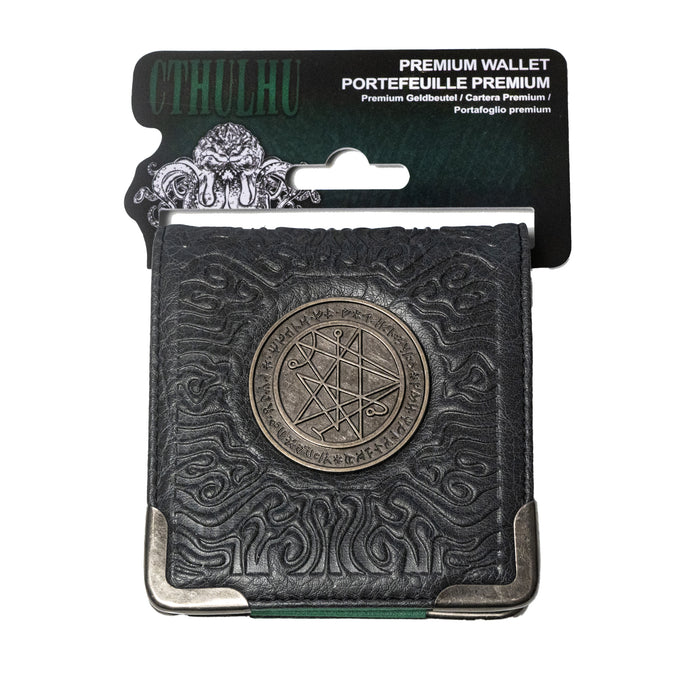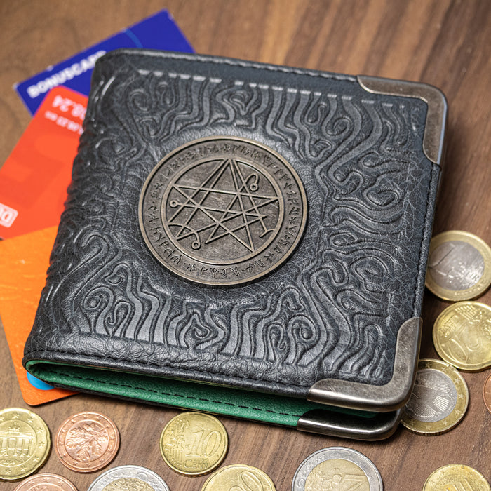 Das Portemonnaie ist im Stil des Nekronomikons designed, einem berühmten Zauberbuch aus dem Cthulhu Mythos. Es ist aus hochwertigem Kunstleder mit geprägtem Muster und mit zahlreichen Ornamenten versehen. Auf der Vorderseite prangt ein Medaillon mit dem Symbol des Nekronomikons.