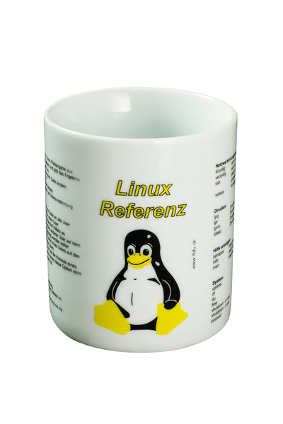 Sur cette tasse sont imprimées des commandes importantes de Linux, de sorte que vous pouvez apprendre et pratiquer confortablement avec un café, un thé ou un cacao chaud à l'ordinateur.