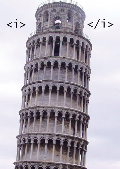 - La tour penchée de Pise : et indiquent dans le code Html le début et la fin de l'écriture en italique.
