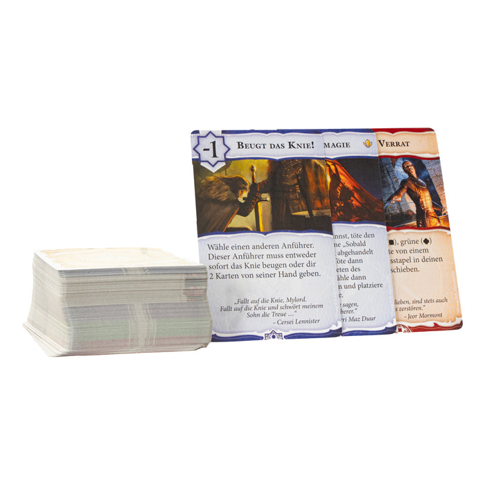 Ce jeu de cartes Game of Throneste transporteégalement dans le monde des dragons, des maisons puissantes et des guerres implacables. Pour vaincre tes adversaires, tu utilises trois types de cartes différents : les cartes de personnage, les cartes d'influence et les cartes d'allié. Sur les cartes, tu rencontreras de nombreux visages connus, comme Tyrion Lannister ou Arya Stark.