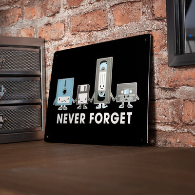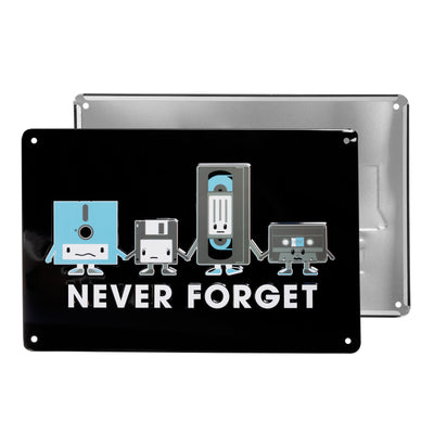 Videokassette, Diskette und Co. mögen zwar aus unserem Alltag verschwunden sein, aber nicht aus unserer Erinnerung. Deshalb sagen wir mit diesem Blechschild Never Forget: Danke für die schöne Zeit. :) An deiner Wand kannst du es mit Nägeln, Schrauben oder doppelseitigem Klebeband befestigen (nicht im Lieferumfang enthalten).