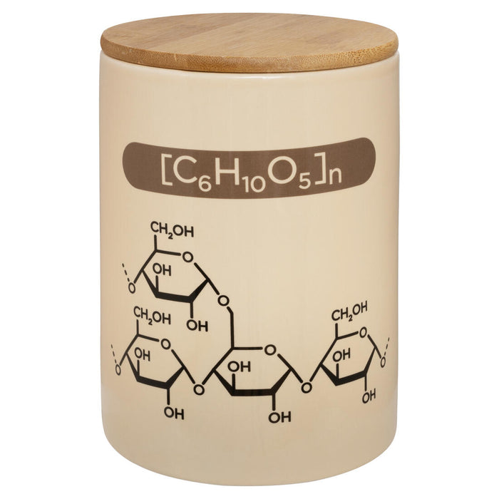 Während die meisten von uns froh sind, die Chemie gemeinsam mit der Schule hinter uns gelassen zu haben, vergessen wir zu oft, dass sie überall lauert. Denn letztendlich ist ja selbst backen nichts anderes, als ein chemisches Experiment. Deswegen haben wir passenderweise den Mehl Vorratsbehälter mit der chemischen Formel ihres Inhalts entwickelt. So kannst du dich dort mit der Chemie umgeben, wo sie stattfindet – ohne deinen Einrichtungsstil der grellen Labor-Ästhetik zu opfern. Dank des Bambusdeckels mit Silikondichtung kann das Mehl auch keine unerwünschten Verbindungen eingehen. ;)