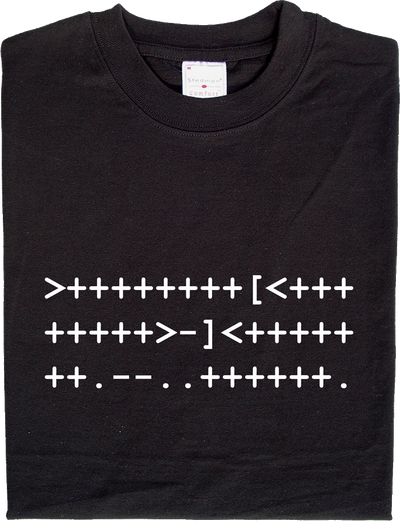 De Brainfuck-programmacode op dit shirt leidt tot de uitvoer van het woord "GEEK".