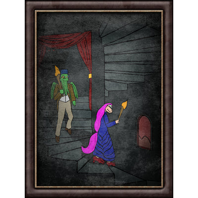 „Turm“ stammt aus seiner Werkreihe Inner Architecture (1926–1946), in der er innere Räume – seelisch wie architektonisch – erkundet. Die düstere Spiraltreppe, das enge Mauerwerk und das winzige Fenster schaffen eine bedrückende Atmosphäre. Zwei seltsame Gestalten mit Fackeln – ein geflügeltes Wesen mit Tentakeln und ein weiblich anmutendes Wesen mit fließend pinkem Haar – wirken wie Reisende durch eine surreale Innenwelt.