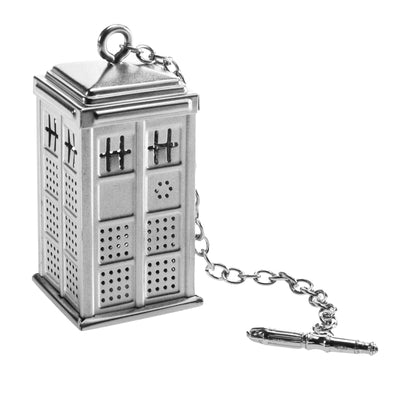 Voor de perfecte dosering zorgt deze kleine metalen TARDIS. Het dak kan worden geopend en het thee-ei is zo eenvoudig te vullen. Hang het vervolgens in een geschikt vat - een glazen kan ziet er natuurlijk het beste uit - en laat het 3-5 minuten trekken. Het draait allemaal om de juiste maat van ruimte en tijd. ;) De greep aan het einde van de ketting heeft trouwens de vorm van een kleine sonische schroevendraaier.