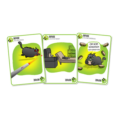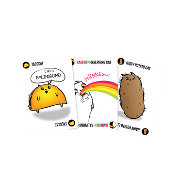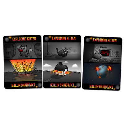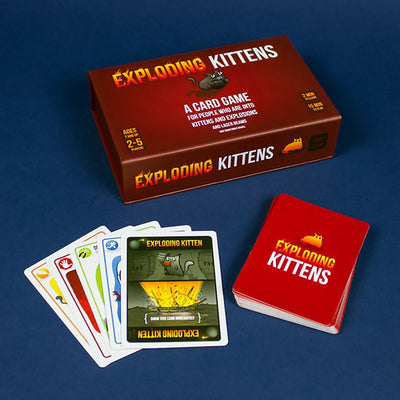 Achtung, hinter Dir! Eine explodierende Katze! Willkommen bei dem Kickstarter-Erfolg Exploding Kittens! Bei diesem Kartenspiel für 2-5 Spieler geht es darum, als letzter Spieler durch die titelgebenden explodierenden Katzen ins Jenseits befördert zu werden. Abwechselnd werden Karten gezogen, bis jemand eine explodierende Katze zieht. Dieser Spieler scheidet aus dem Spiel aus, sofern er nicht durch eine Sonderkarte die Katze "entschärft". Und wie entschärft man Katzen am besten? Genau, mit Laserpointern oder Katzenminze-Sandwiches!