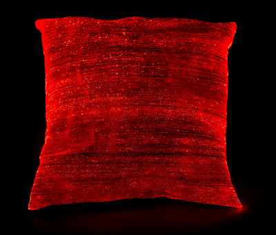 Diese Eigenschaft hat sich der Hersteller dieses Kissens ebenfalls zunutze gemacht. Die Spezialtextilie, die dieses Kissen ziert, besteht zum großen Teil aus Glasfasern*), die von LEDs angestrahlt werden. Beim Einweben werden die hauchdünnen Glasfasern immer wieder mit Absicht geknickt. Normalerweise sieht man durch Glasfaserkunststoffe geschicktes Licht nämlich fast nur da, wo es am Ende wieder rauskommt. An den Stellen, an denen die Glasfasern geknickt wurden, scheint das Licht aber umso heller und der punktuelle Leuchteffekt entsteht.