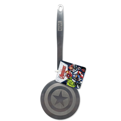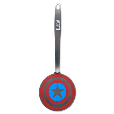 En met de 'Marvel Captain America'-spatel kun jij voortaan burgers, steaks en co. net zo omdraaien als de legendarische Avenger! De stevige spatel laat je zelfs het meest eigenzinnige bakgoed van de grill of uit een geschikte pan tillen – en ondertussen word je heel eenvoudig een echte held aan de grill of het fornuis! :)