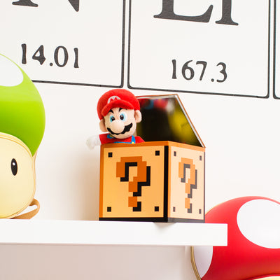 Het blik, vervaardigd uit metaal en in het ontwerp van de iconische vraagtekenboxen, biedt je veel opbergruimte voor alles wat je hart begeert: van koekjes tot wijngom, tot schildpaddenschilden en magische paddenstoelen kan veel worden opgeborgen in de ruime container uit het Mushroom Kingdom. Zelfs een Nintendo GameCube vindt plaats voor de geconcentreerde lading aan Mario-ceptie in de box.