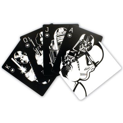 Toegegeven, de "Star Wars"-speelkaarten hebben qua stijl een voorsprong: Ze komen in elegant zwart-wit en worden geleverd in een stevige metalen doos met het reliëf van een Stormtrooper. Op de individuele kaarten vind je helden en schurken uit de legendarische filmreeks, waaronder Luke, Leia, Vader en R2-D2. Naar verluidt zijn de kaarten ook gecoat met een speciaal materiaal dat het gebruik van de Force om te vals te spelen voorkomt... ;)
