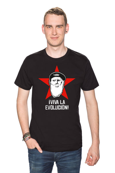 Wie gelooft dat onze menselijke voorouders pas 10.000 jaar geleden op dinosaurussen reden, moet zeker op zoek gaan naar een ander T-shirt en niet verder lezen. Waar, wanneer en of guerrillaoorlog een geschikte tactiek is, bespreken we ook liever ergens anders. Feit is dat evolutie onmiskenbaar is en in tegenstelling tot sommige andere theorieën, inclusief het socialistische eenpartijstelsel, ook zeer levendig. Daarom is niemand minder dan Charles Darwin voor ons het meest geschikte idool, waardoor hij de ereplaats op een shirt krijgt. Op de typische evolutionistenbaret zit trouwens de Darwin-vis, die in tegenstelling tot het christelijke voorbeeld voeten heeft. Want zoals we weten, komen we allemaal uit de zee. Ook degenen die er niet in geloven. Zelfs creationisten. Met een beetje geluk zet de evolutie dat binnenkort weer recht, geheel volgens het motto survival of the fittest. ;)