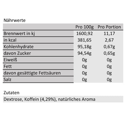 Een zakje bevat 2,33 g met 4,29% cafeïne en is voldoende voor ongeveer 330 ml vloeistof. De exacte ingrediënten vind je op de foto. Je kunt echter ook eerst wat minder nemen, want cafeïne werkt bij iedereen anders. Bij overmatig gebruik loop je altijd het risico om in een tweede overactieve Fry te veranderen. Meer dan drie porties per dag moet je in ieder geval niet drinken, soms moet het gewoon de ouderwetse slaap zijn. ;)